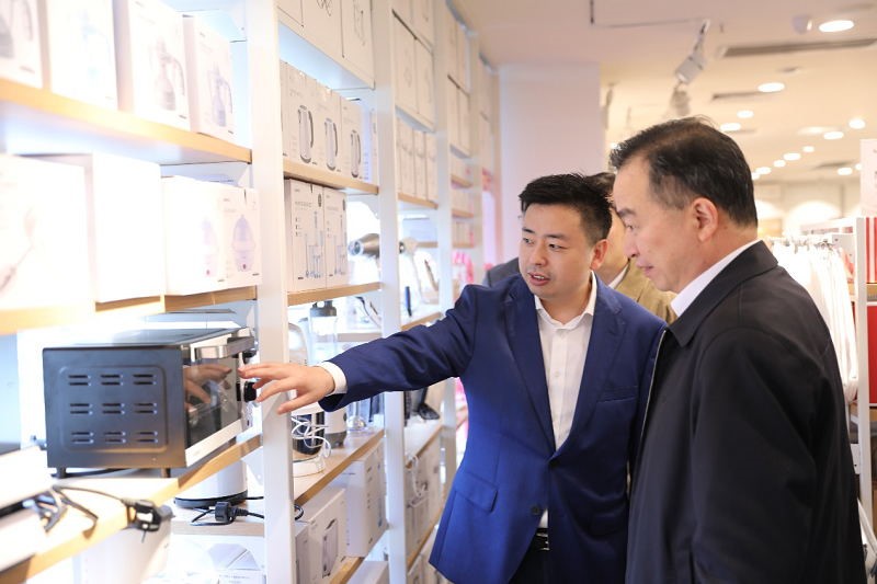 葉國富向荔灣區政協主席樊伯歡介紹名創優品家電產品