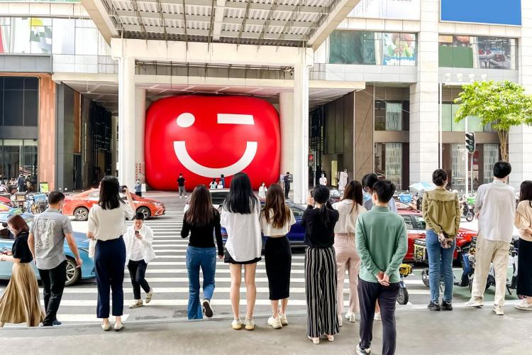 2022世界微笑日,一個偌大的微笑出現(xiàn)在了廣場樓層之間,在來往穿梭的人群之間尤為顯眼,名創(chuàng)優(yōu)品在世界微笑日倡導(dǎo)——“在生活的夾縫中保持微笑”,其中最大的微笑裝置位于廣州天河區(qū)高德置地秋廣場,高度約10米,裝置旁還設(shè)有二維碼,品牌消費者可以通過AI掃描wink微笑領(lǐng)取福利,鼓勵人們與“焦慮”和解。