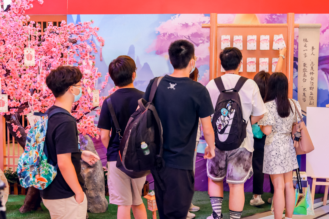 為讓觀展者真切感受到二次元的世界,更好體驗(yàn)到IP破圈的快樂(lè),名創(chuàng)優(yōu)品塑造了二次元破圈場(chǎng)景,非人哉青春學(xué)院課堂場(chǎng)景、狐妖小紅娘求簽場(chǎng)景、魔道祖師動(dòng)畫(huà)把酒言歡場(chǎng)景、一人之下異能測(cè)試場(chǎng)景,四大場(chǎng)景融合IP的內(nèi)容核心。此外,名創(chuàng)優(yōu)品四大國(guó)漫IP聯(lián)名產(chǎn)品提前面世,結(jié)合IP場(chǎng)景進(jìn)行陳列,通過(guò)四大時(shí)光隧道將觀展者從三次元帶往二次元世界,讓觀展者近距離感受?chē)?guó)漫IP的魅力。