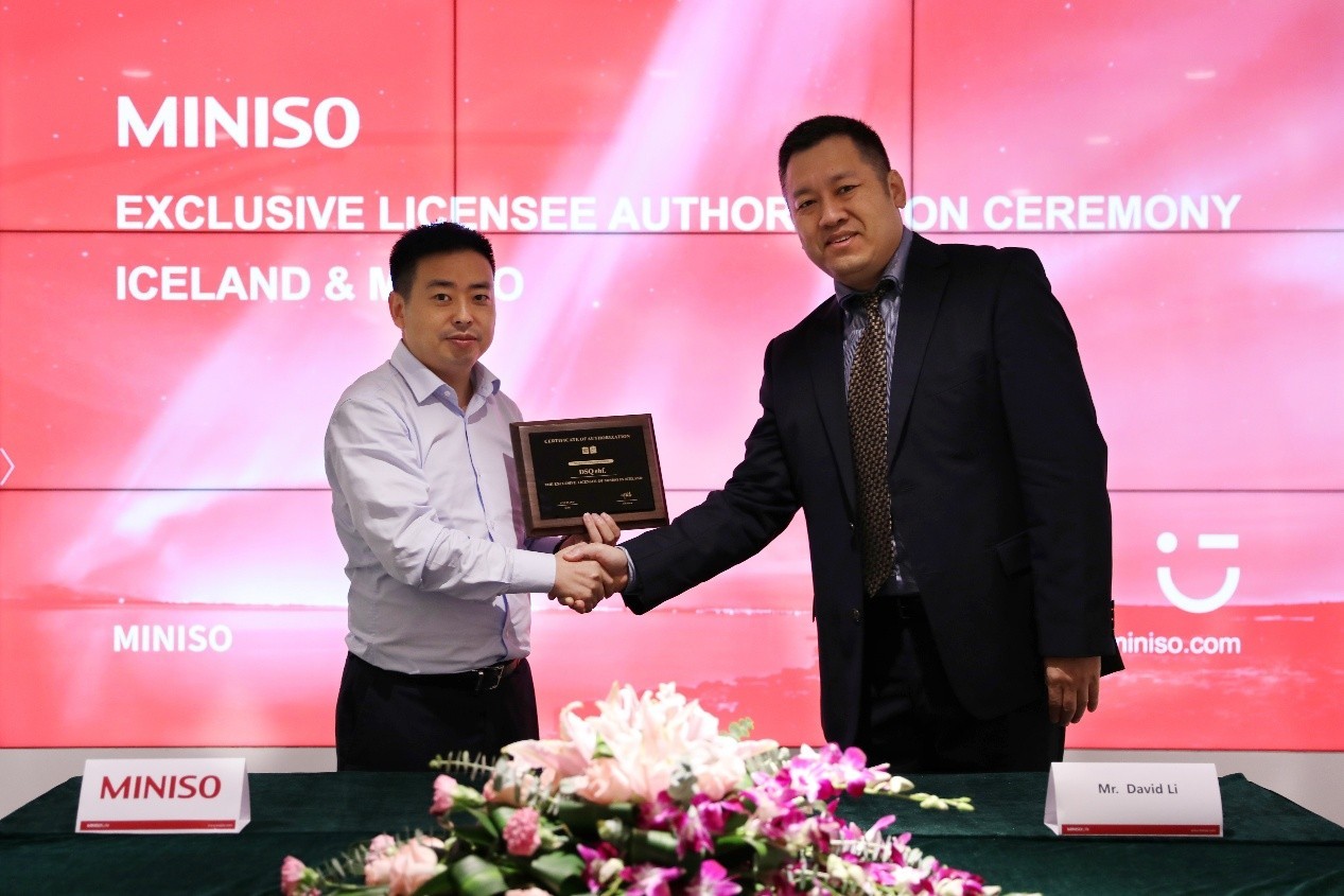 授權儀式,名創優品創始人葉國富先生(左)與冰島市場總代理David Tong Li(右)