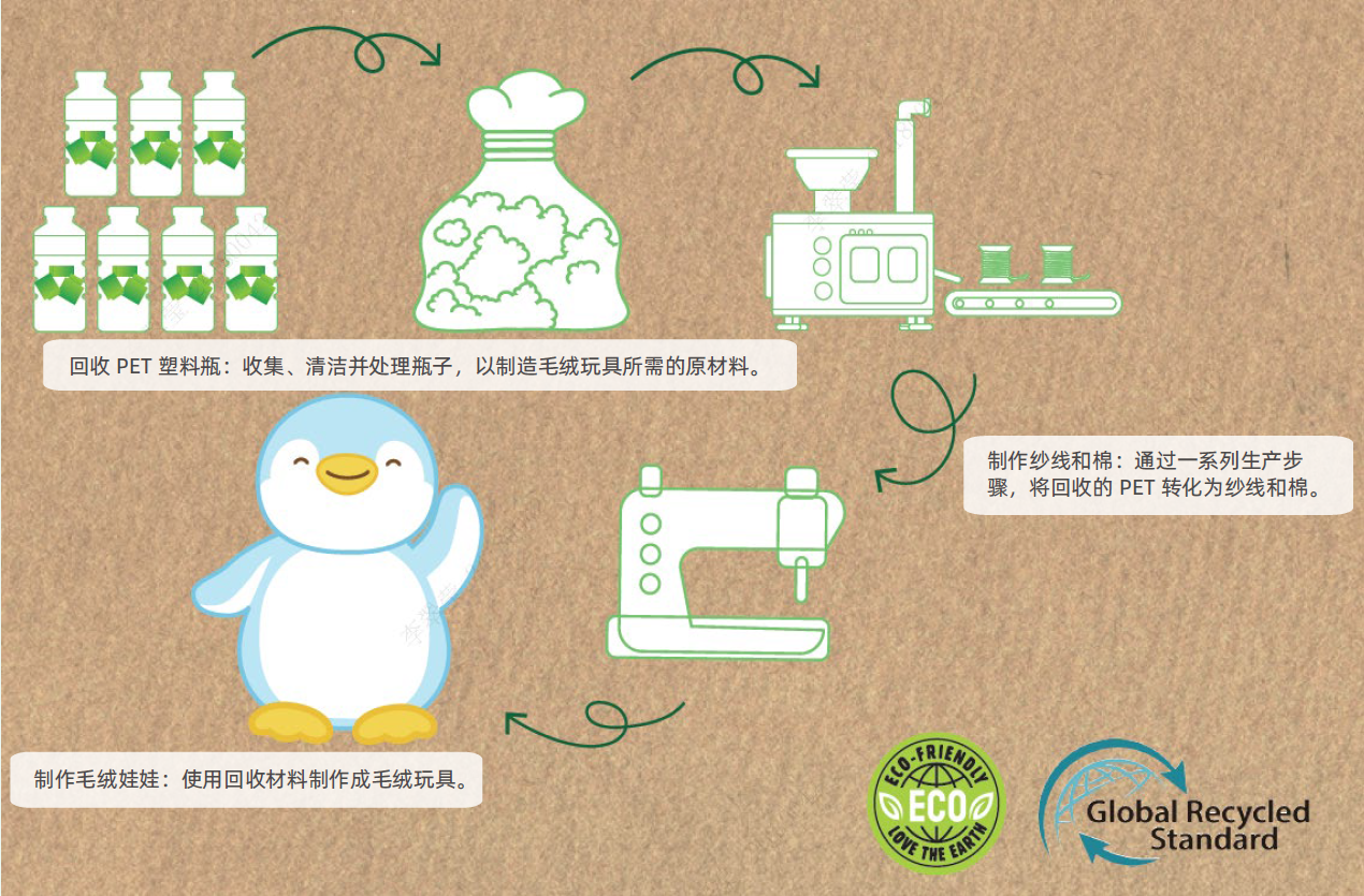 名創優品不斷探索創新綠色產品,我們在銷售的產品中使用可持續的材料,促進材料的循環回收利用,以實現從源頭減少資源消耗。2023年,我們推出了ECO環保材質毛絨公仔,將回收的PET塑料瓶通過消毒清洗、粉碎、混合、干燥、熔融、擠出等一系列特殊工序,制成織線和棉花,最后再將此作為原材料制作一只完整的毛絨公仔。我們推出的ECO環保材質毛絨公仔均獲得了全球回收標準GRS的認證。GRS認證證書確保我們的產品達到了回收物、社會與環境保護措施以及化學物質限制的標準。